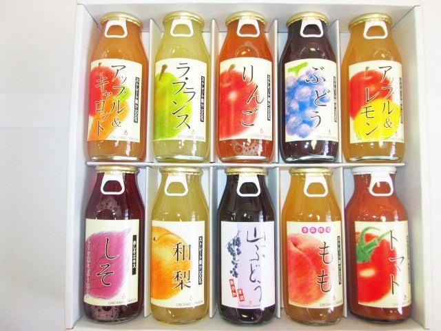 りんご、ぶどう、ラ・フランス、もも、和なし、アップルレモン、アップルキャロット、しそ、トマト、山ぶどう 各1本ずつ 計10本